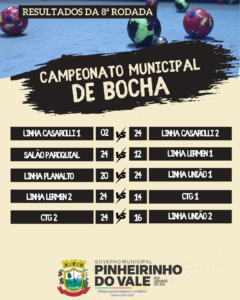 Resultados da 8ª rodada do Campeonato Municipal de Bocha são divulgados No último sábado, dia 28 de março, foi realizada a 8ª rodada do Campeonato
