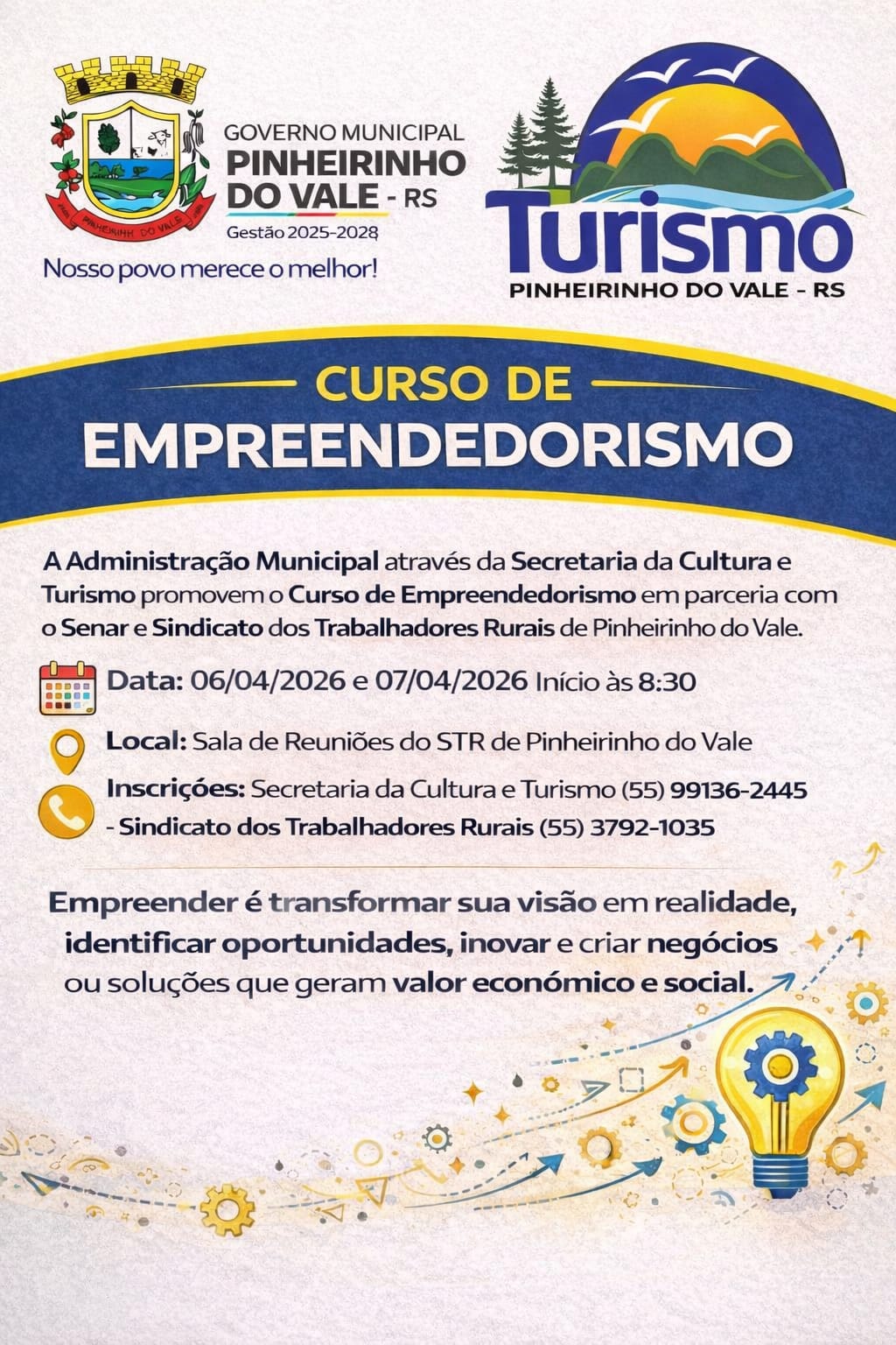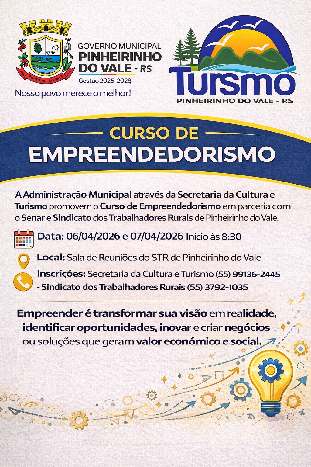Curso de Empreendedorismo será realizado em Pinheirinho do Vale A Administração Municipal de Pinheirinho do Vale, por meio