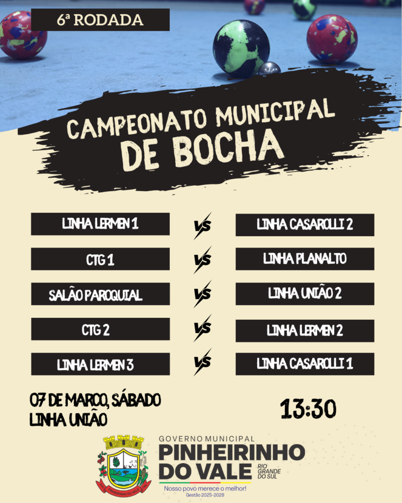 O Campeonato Municipal de Bocha de Pinheirinho do Vale segue movimentando as comunidades do município. Neste sábado, 07 de março, será realizada a 6ª rodada da competição, com partidas programadas para a comunidade de Linha União, a partir das 13h30.
