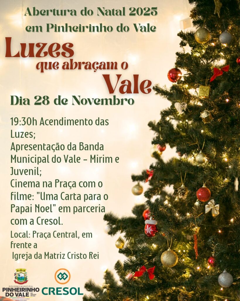 A Administração Municipal de Pinheirinho do Vale convida toda a comunidade para a abertura oficial do Natal 2025 – “Luzes que Abraçam o Vale”, que acontece na próxima sexta-feira, dia 28 de novembro, na Praça Central, em frente à Igreja Matriz Cristo Rei.