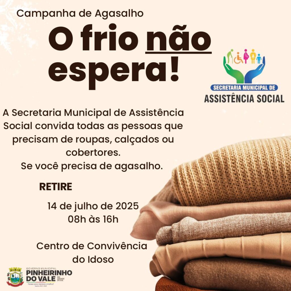 A Administração Municipal de Pinheirinho do Vale, por meio da Secretaria de Assistência Social, convida a comunidade para participar da Campanha do Agasalho 2025.