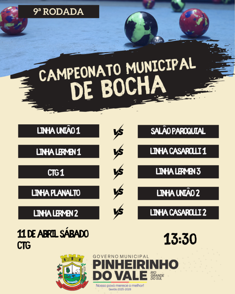 O Campeonato Municipal de Bocha de Pinheirinho do Vale terá sequência neste sábado, dia 11 de abril, com a realização da 9ª rodada da competição.