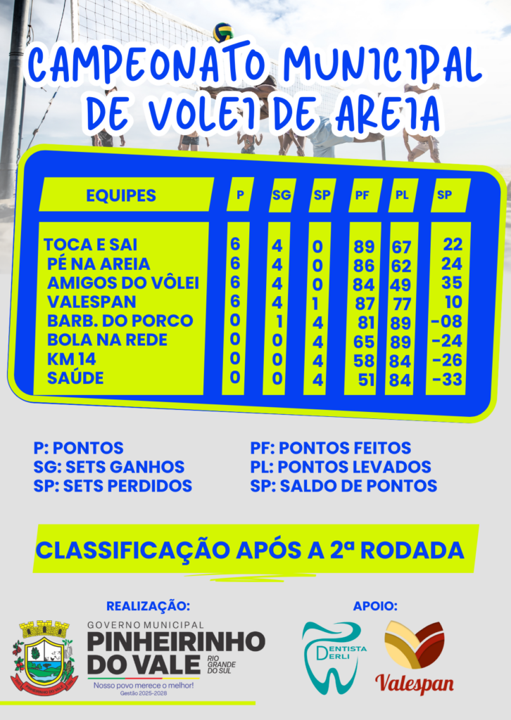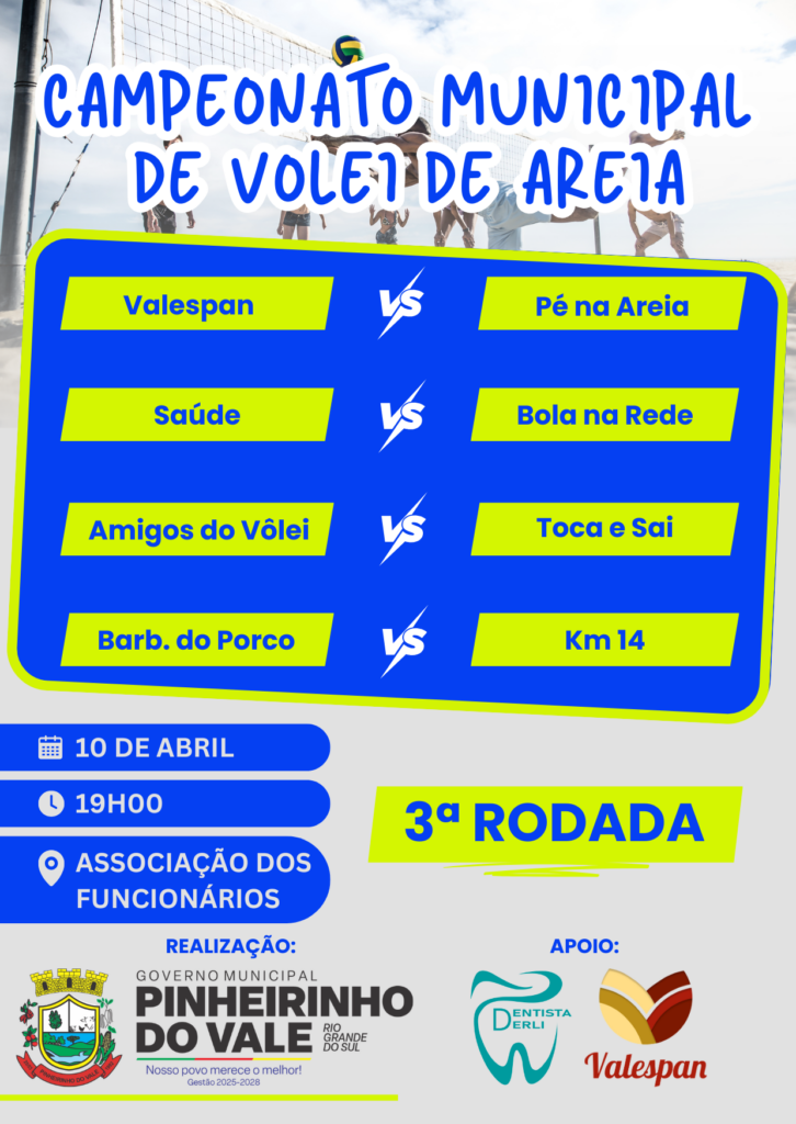 O Campeonato Municipal de Vôlei de Areia de Pinheirinho do Vale teve continuidade com a realização da segunda rodada, marcada por partidas equilibradas e elevado nível técnico entre as equipes participantes.
