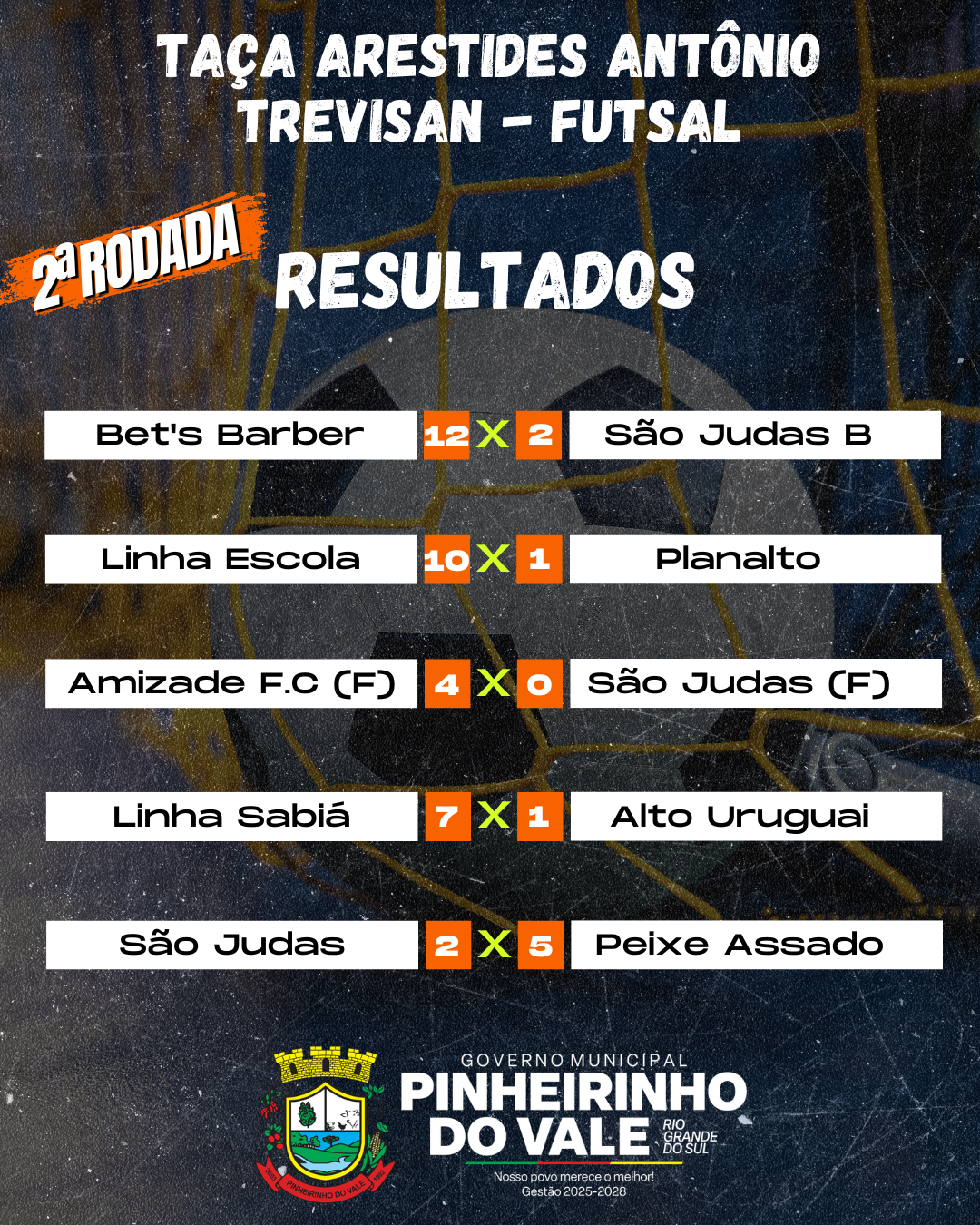 Campeonato Municipal de Futsal – Taça Arestides Antônio Trevisan A Prefeitura Municipal de Pinheirinho do Vale divulga os resultados da segunda rodada do Campeonato Municipal de Futsal – Taça Arestides