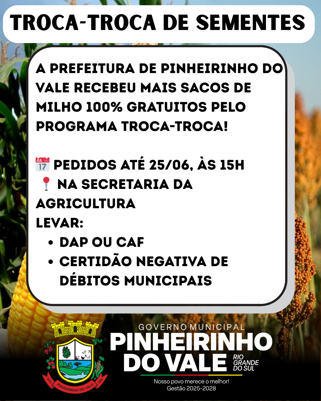 🚜 Troca-Troca: nova remessa chegou!Aproveite a nova liberação de milho 100% gratuito pelo programa Troca-Troca! 📅 Faça seu pedido até terça, 25/06, às 15h, na Secretaria da Agricultura. 📄 Leve