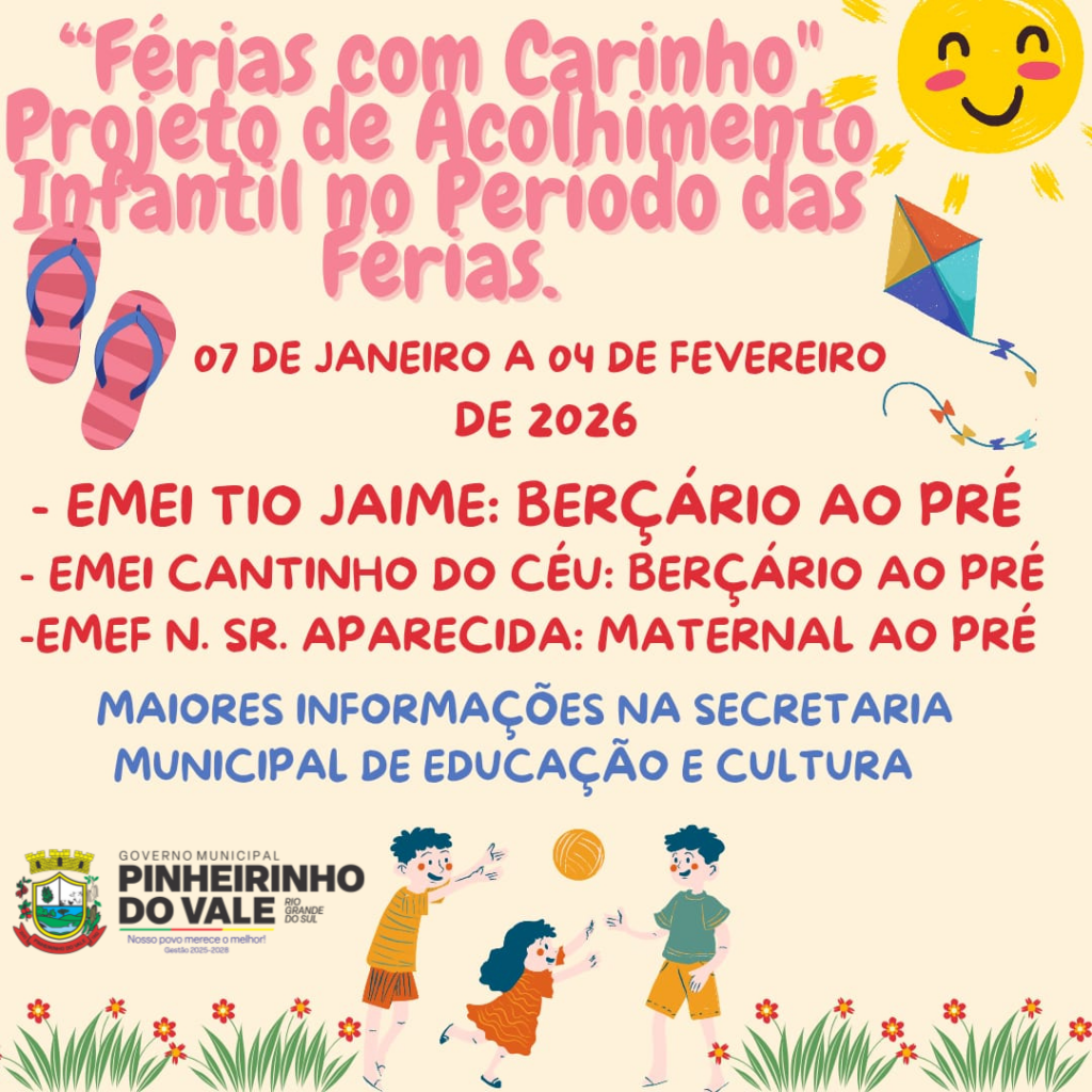 A Administração Municipal de Pinheirinho do Vale, por meio da Secretaria Municipal de Educação e Cultura, promove o projeto “Férias com Carinho”, uma iniciativa voltada ao acolhimento infantil durante o período de férias escolares.