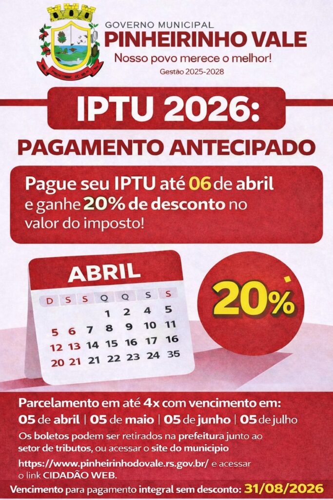 A Prefeitura de Pinheirinho do Vale informa que já está disponível o IPTU 2026.