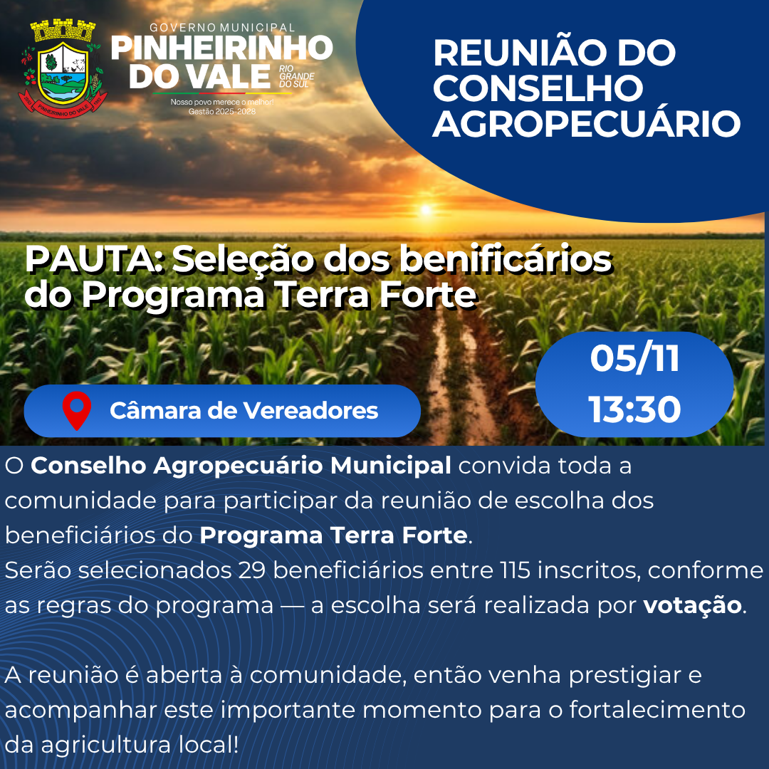 Reunião do Conselho Agropecuário definirá beneficiários do Programa Terra Forte O Conselho Agropecuário Municipal convida toda a comunidade para participar da reunião de escolha dos beneficiários do Programa Terra Forte.