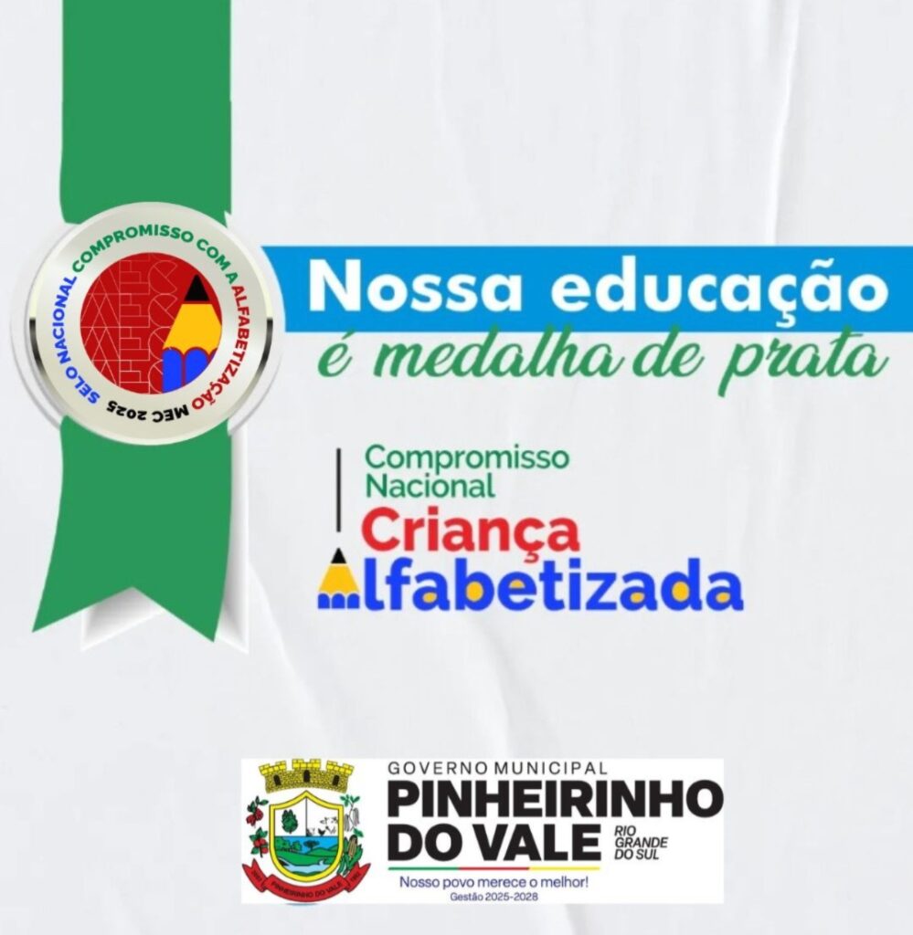 O município de Pinheirinho do Vale, por meio da Secretaria Municipal de Educação, foi reconhecido com o Selo Prata do Compromisso Nacional Criança Alfabetizada, iniciativa do Ministério da Educação (MEC) que valoriza redes de ensino comprometidas com a alfabetização das crianças na idade certa.