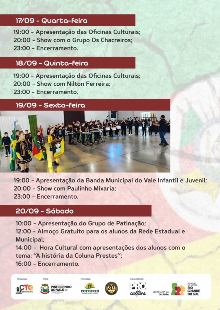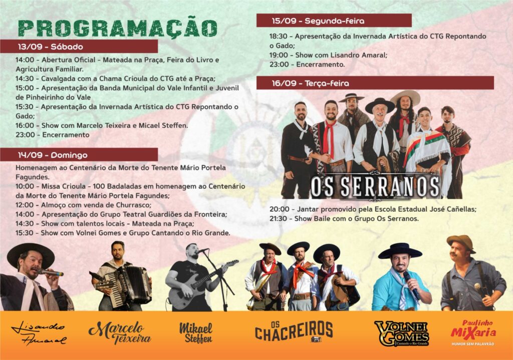 Com uma programação diversificada, o evento contará com cavalgadas, apresentações artísticas, invernadas, feira do livro, agricultura familiar, grupos teatrais, homenagens históricas e uma série de shows com artistas consagrados como Os Serranos, Os Chacreiros, Volnei Gomes, Paulinho Mixaria, Lisandro Amaral, Marcelo Teixeira & Micael Steffen, entre outros.