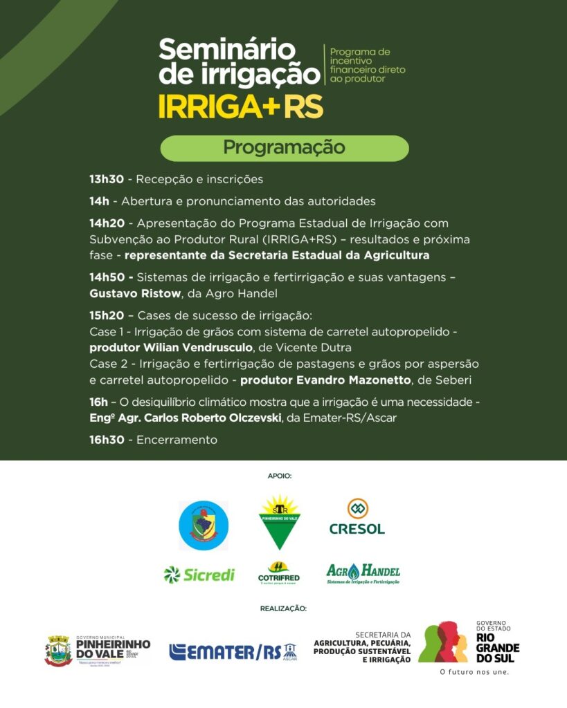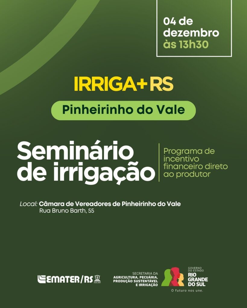 A Administração Municipal de Pinheirinho do Vale, em parceria com a Secretaria Estadual da Agricultura, Pecuária, Produção Sustentável e Irrigação, Emater/RS-Ascar e entidades apoiadoras, promove no dia 4 de dezembro, às 13h30, o Seminário de Irrigação – IRRIGA+RS.