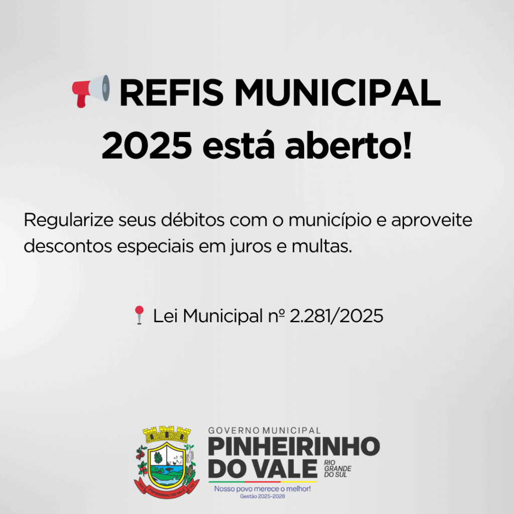 A Prefeitura de Pinheirinho do Vale informa que está aberto o Programa de Recuperação Fiscal – REFIS Municipal, destinado a regularizar débitos de contribuintes pessoas físicas e jurídicas com o município.