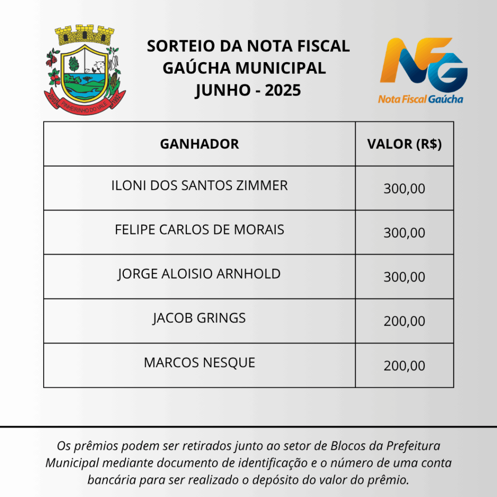 No último dia 26 de junho de 2025, foi realizado o sorteio mensal referente ao mês de junho, através da plataforma do Nota Fiscal Gaúcha (NFG). Foram sorteados três prêmios de R$ 300,00 e dois prêmios de R$ 200,00.