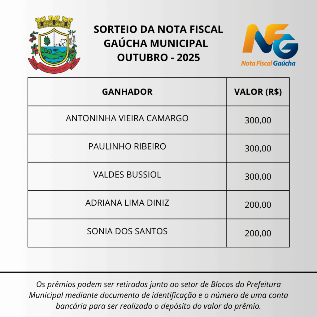 No último dia 30/10/2025, foi realizado o sorteio mensal referente ao mês de Outubro/2025 através da plataforma do NFG, sendo três prêmios de R$ 300,00 e dois prêmios de R$ 200,00, tendo como ganhadores nos prêmios municipais.